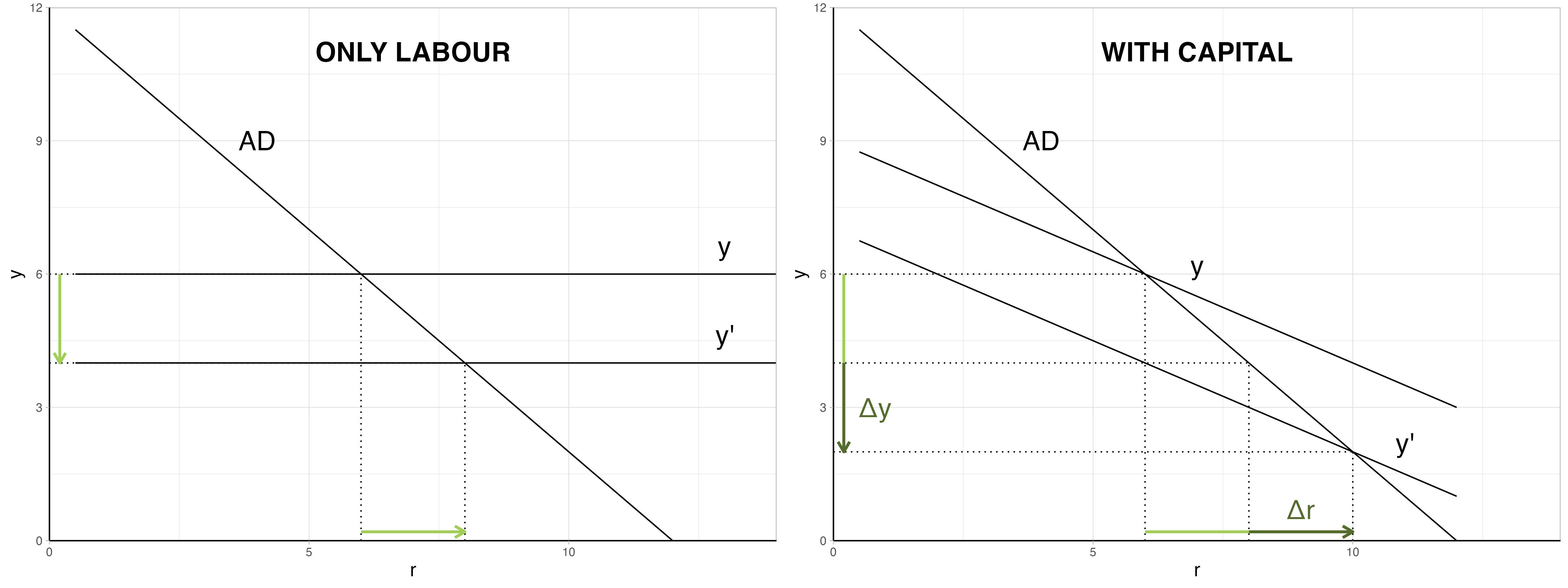 For the technically-minded, I show the mathematics in the technical notes below. The key point to understand is that in NK models with only labour, natural output really is independent of the interest rate. Once introducing capital, it is not. And this leads to one version of the monetary policy doom loop: if you try to bring down demand by raising interest rates, that also reduces natural output or supply, and demand and supply enter a race to the bottom until demand finally catches up and inflation is stabilised.