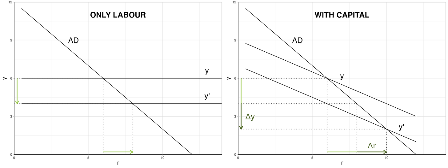 Now consider the right-hand-side panel. Here, nautral output slowly declines with higher interest rates. This is because higher borrowing costs (the interest rate is higher) reduce the productive capacity of the economy. Suppose the same supply shock hits the economy, downward-shifting natural output. Check out where the new intersection of demand and output is, that is, where the new interest rate is that stabilises inflation: at a lower level of output and a higher interest rate, as compared to where it was in the left panel. Because natural output declines in the interest rate, the central bank basically has to produce a larger output drop so that aggregate demand can chase down natural output. As doom loop as it gets, if you ask me.